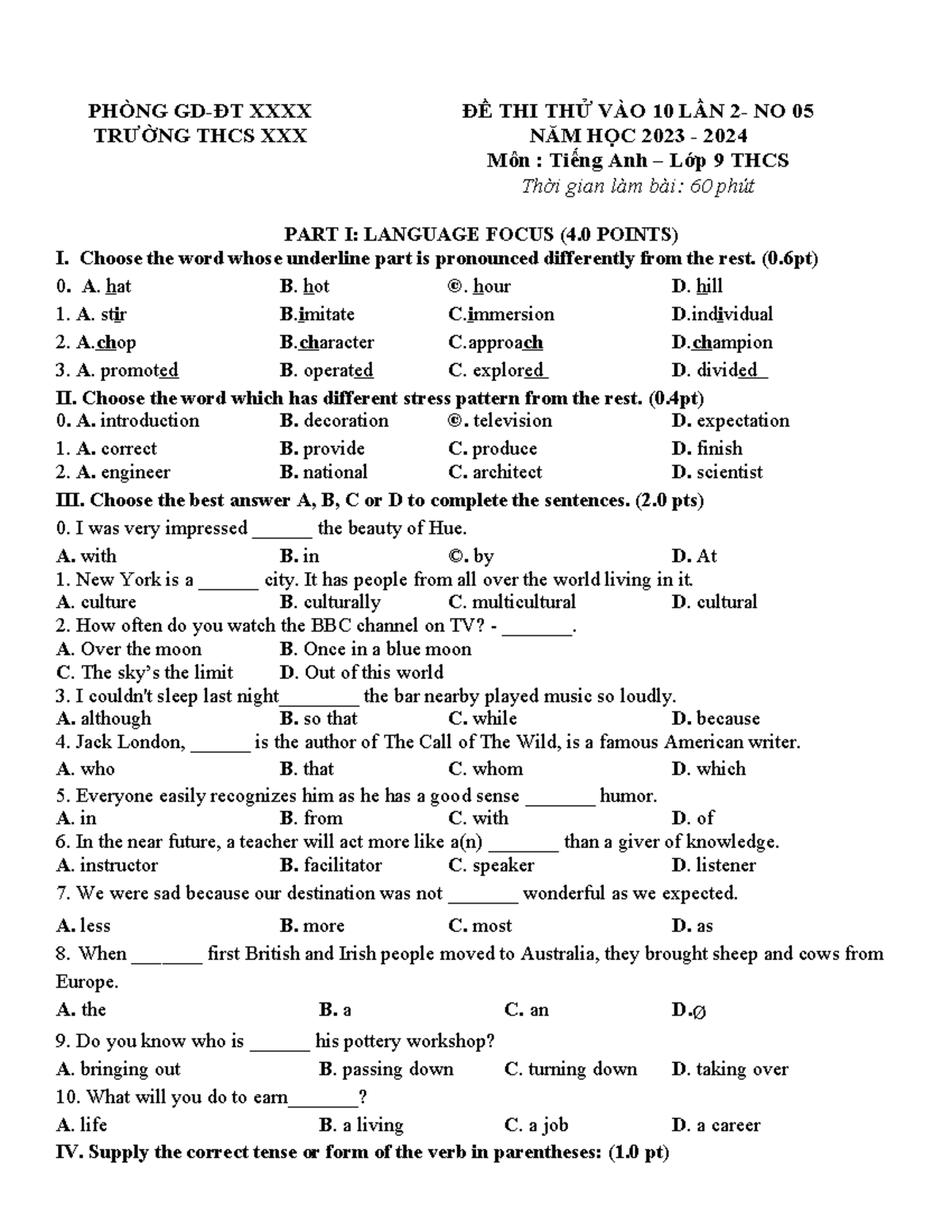 ĐỀ THI THỬ VÀO 10 LẦN 2 - NO 05 NĂM HỌC 2023-2024 Môn: Tiếng Anh Lớp 9 ...