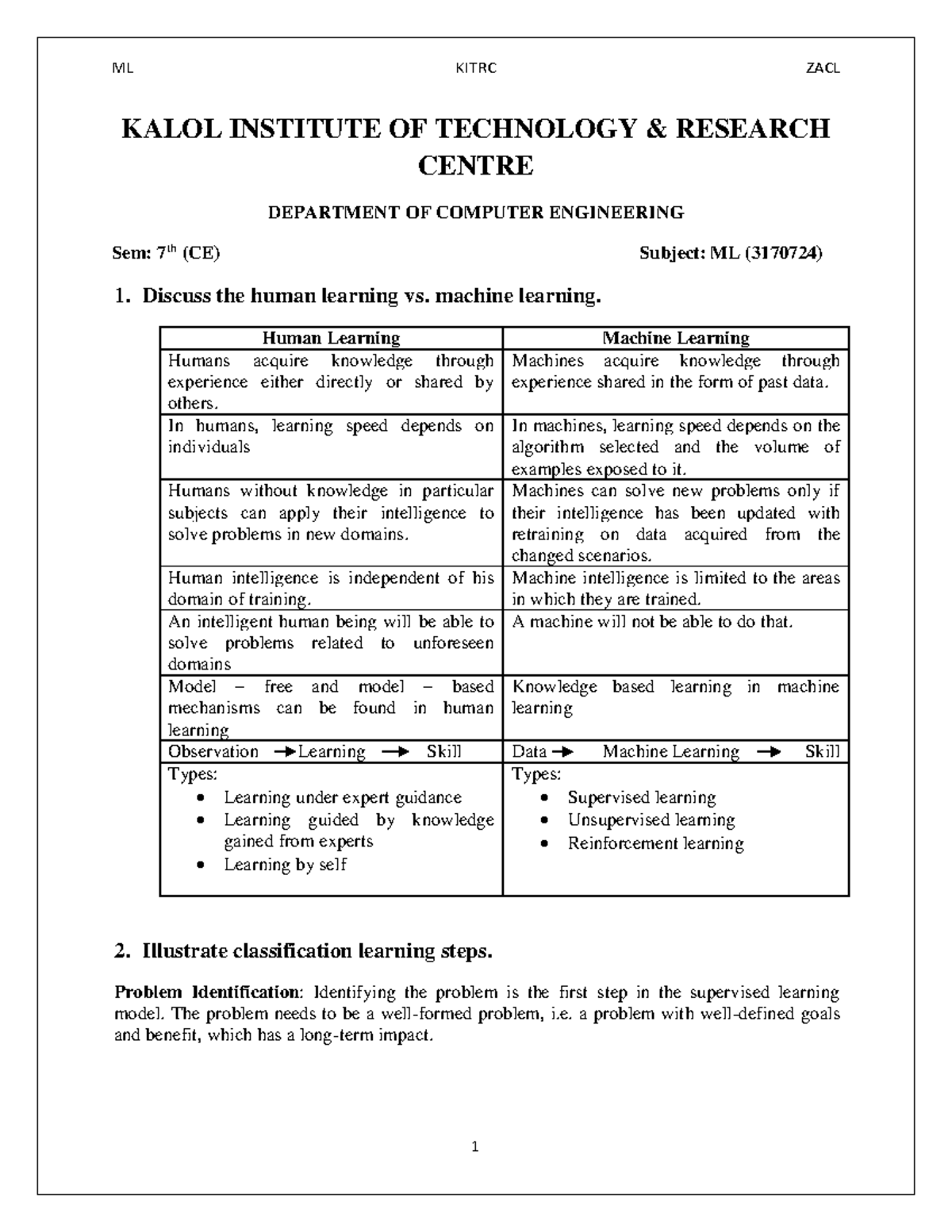 ML (3170724) Sem 7: Human vs. Machine Learning Insights - Studocu