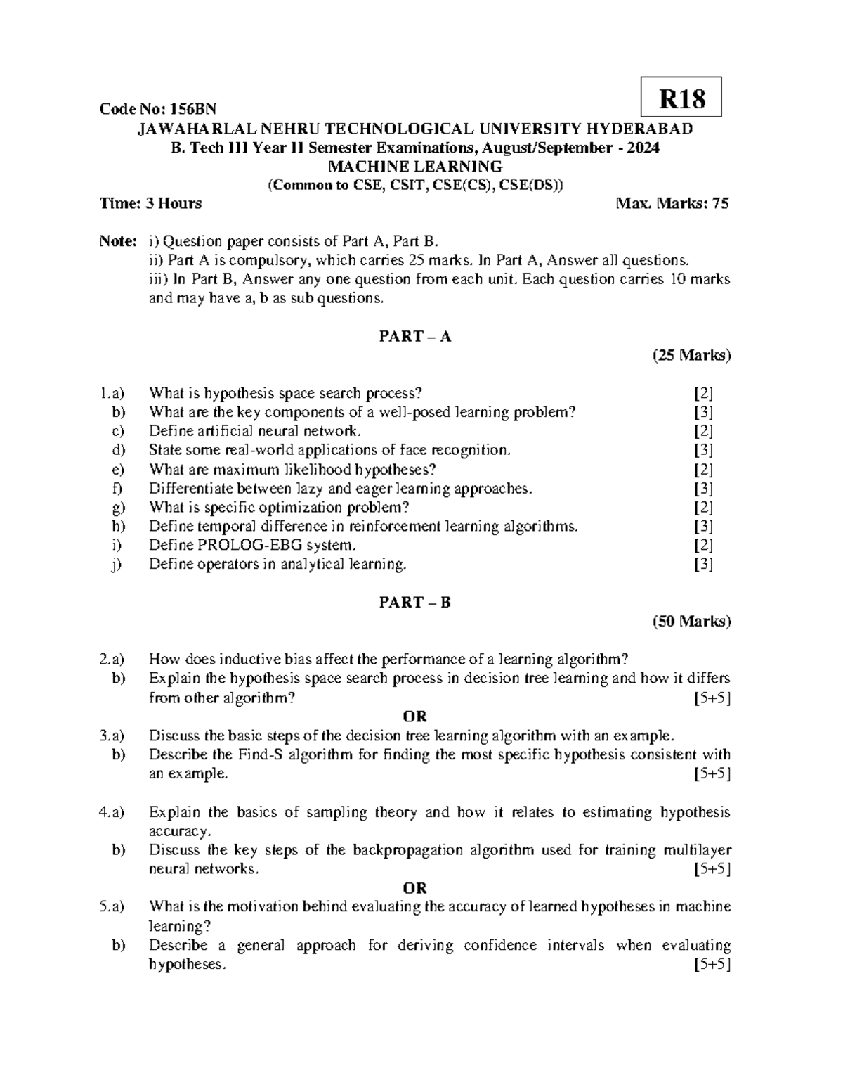 ML QP - Machine Learning Exam Questions (R18 Code: 156BN) - Studocu