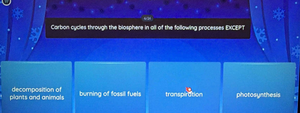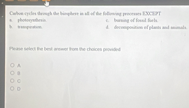 Solved: Carbon cycles through the biosphere in all of the following ...