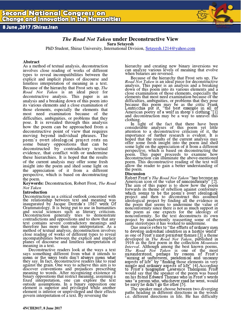 📌 A Deconstructive Analysis of Robert Frost's The Road Not Taken Essay ...