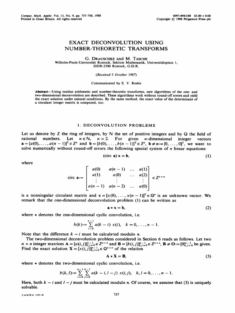 Exact Deconvolution Using Number-Theoretic Transforms: Comput. Math ...