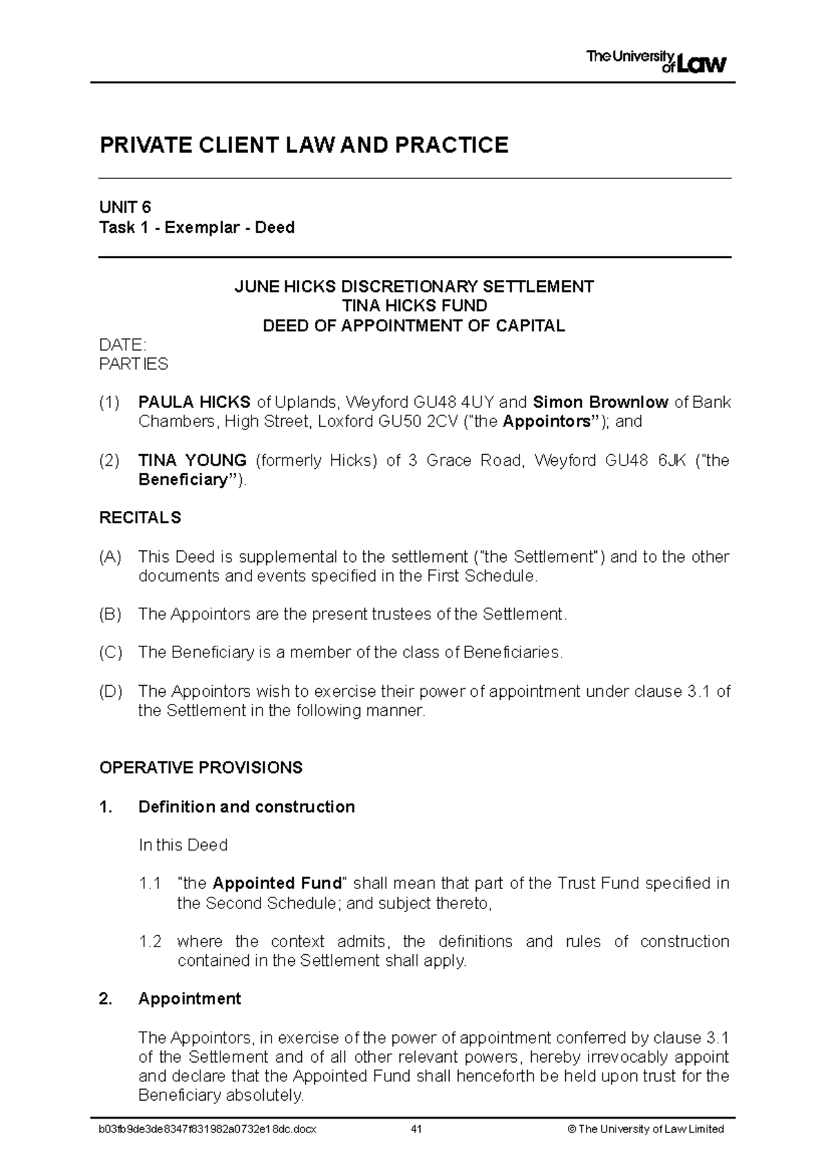 Deed exemplar - deed - PRIVATE CLIENT LAW AND PRACTICE UNIT 6 Task 1 ...