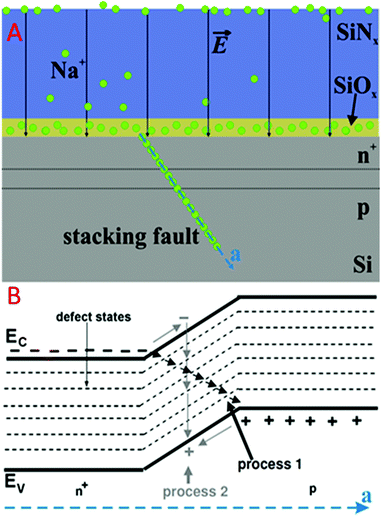 Schematic diagram of a defect level in the band gap of a semiconductor ...