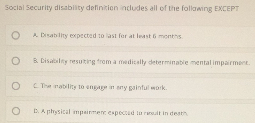 Solved: Social Security disability definition includes all of the ...