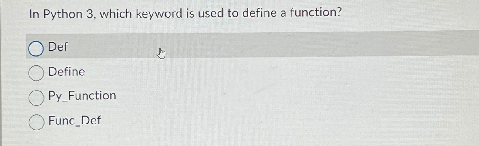 Solved In Python 3, which keyword is used to define a | Chegg.com