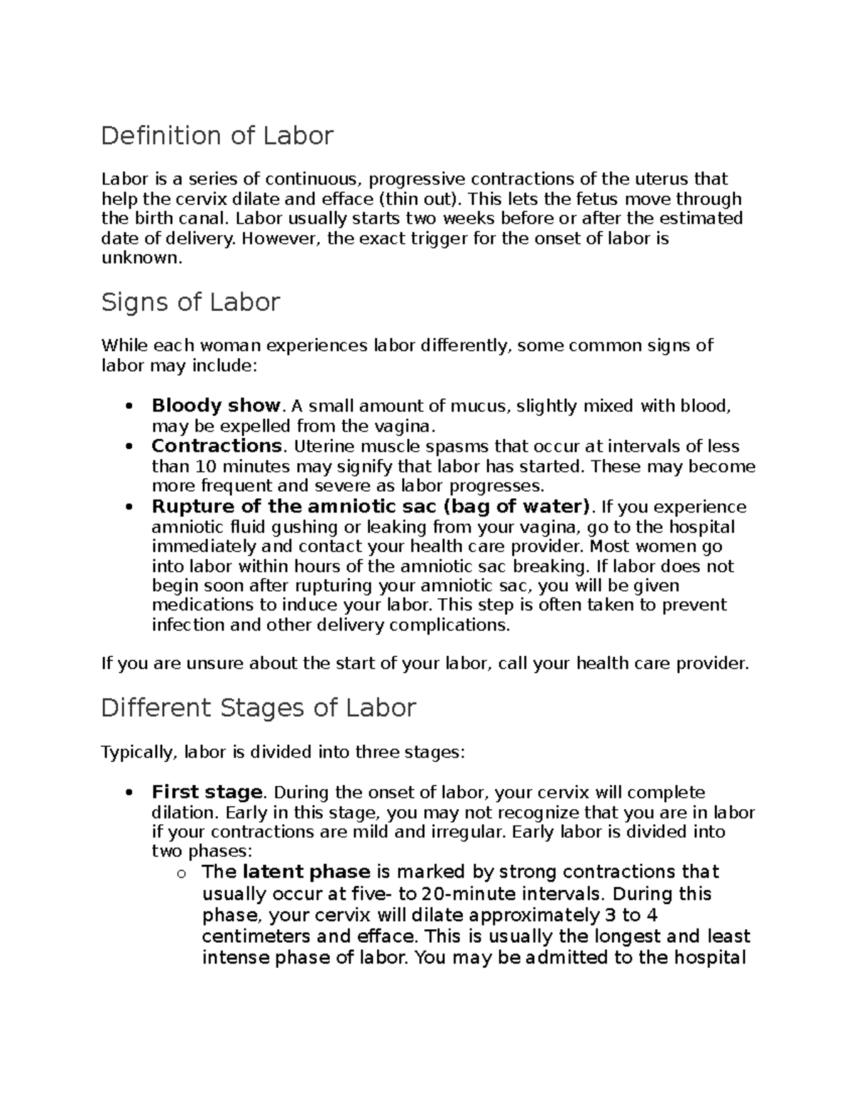 Signs OF Labor - Definition of Labor Labor is a series of continuous ...