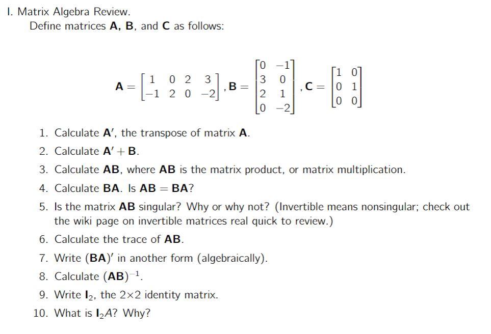 Solved I. Matrix Algebra Review. Define matrices A,B, and C | Chegg.com