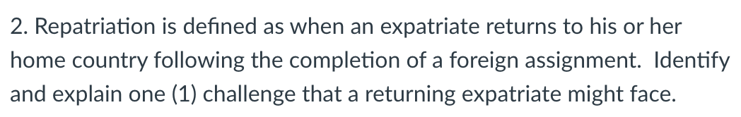 Solved 2. Repatriation is defined as when an expatriate | Chegg.com