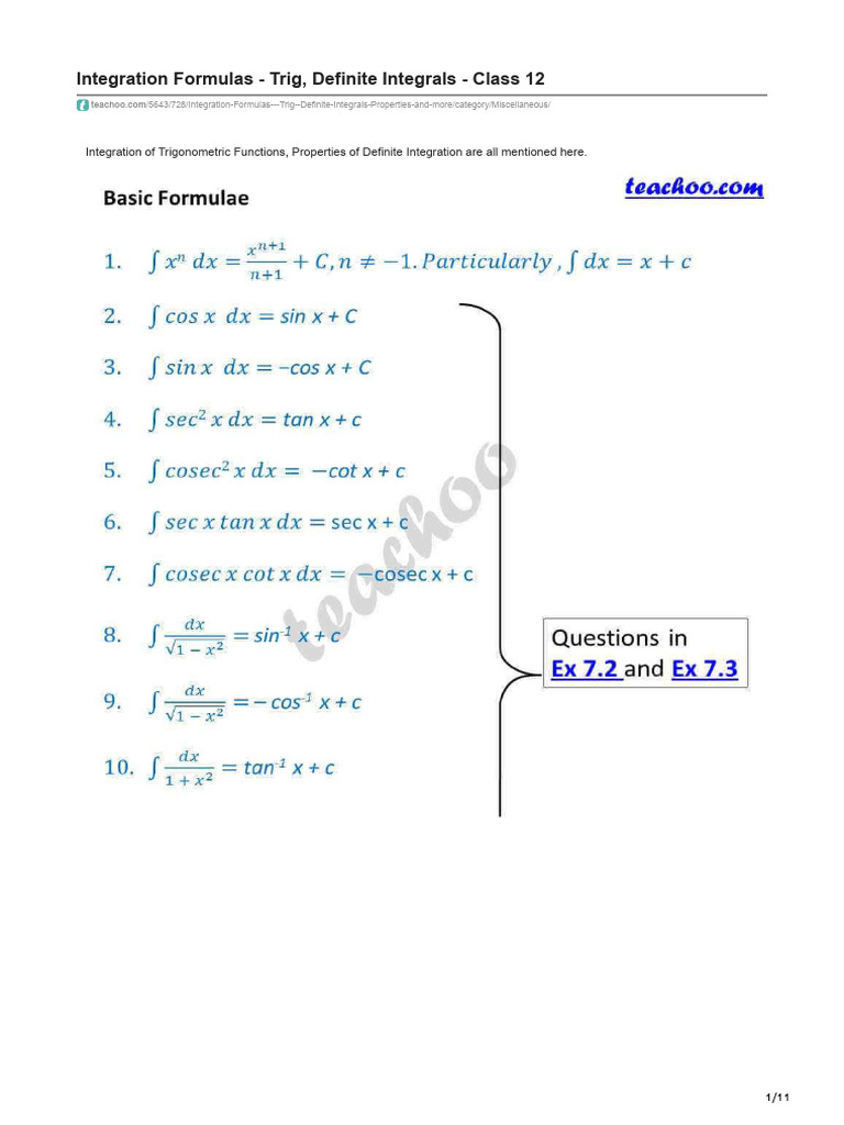 Integration Formulas - Trig, Definite Integrals - Class 12 - PDF