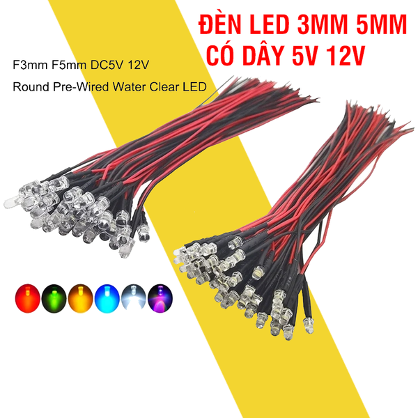Set 5 Bóng đèn led 5v 12v có dây dài 20cm 3mm/5mm nhiều màu chất lượng
