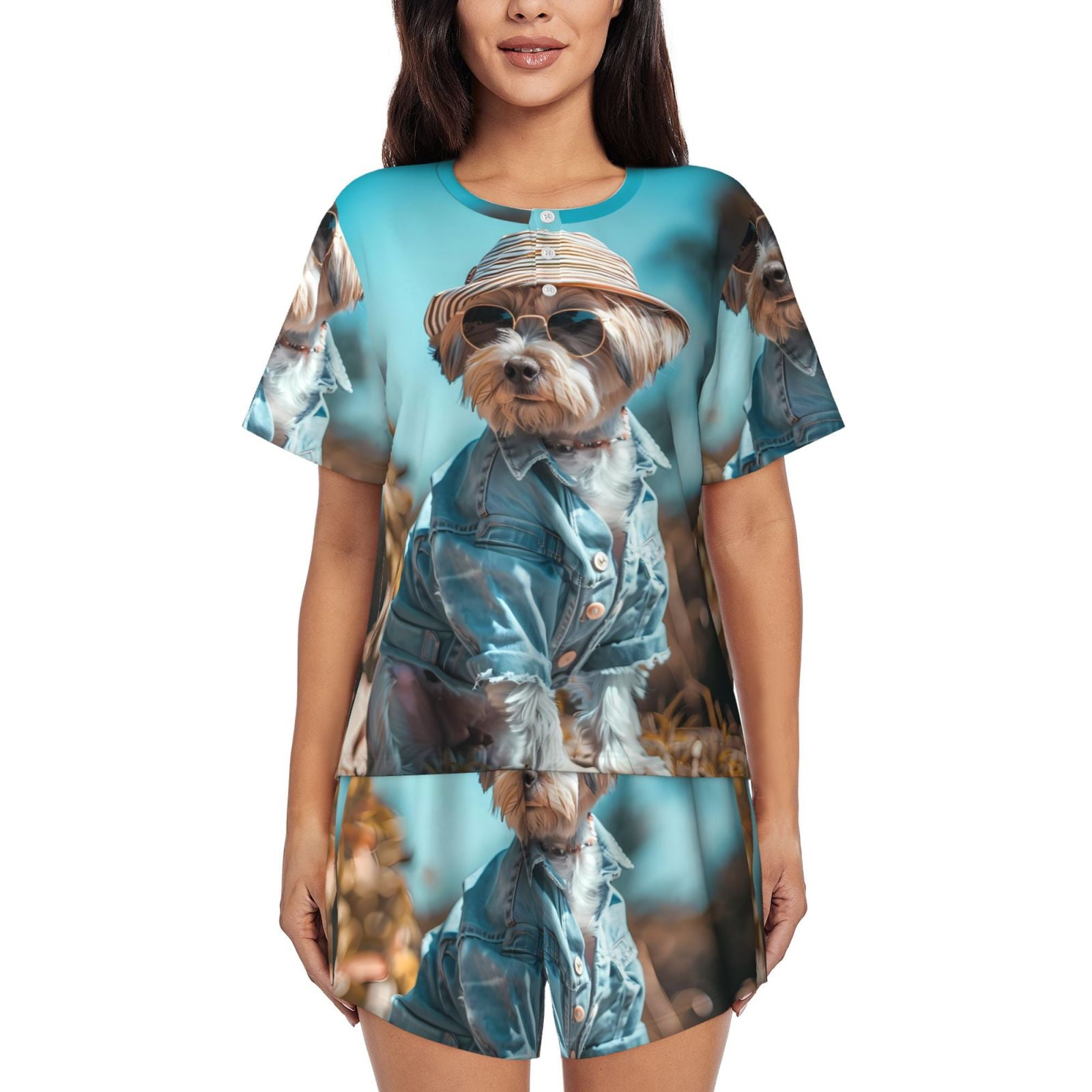 Cauagu Stylish Dog in Denim Outfit for Women's Round Neck Pajama Set ...