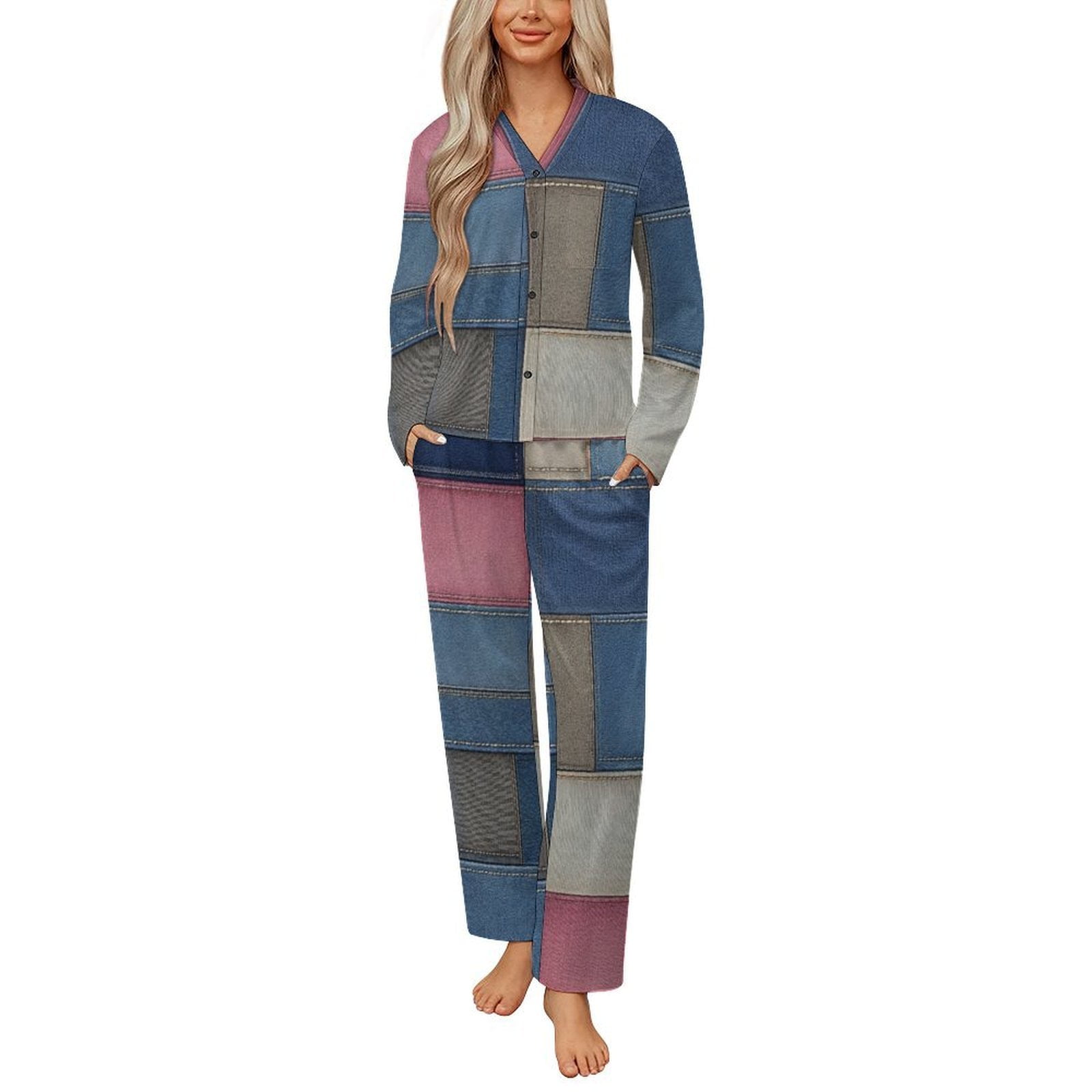 Colorful Denim Patchwork Pattern Womens Pyjamas Set Button Up Pyjamas ...