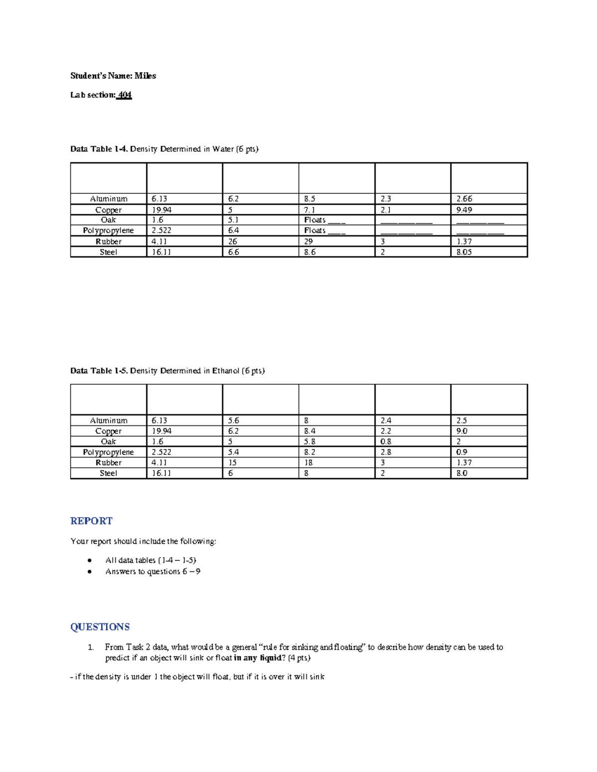 Density Lab Data Sheet for Ilyas A. - September 23, 2022 - Studocu