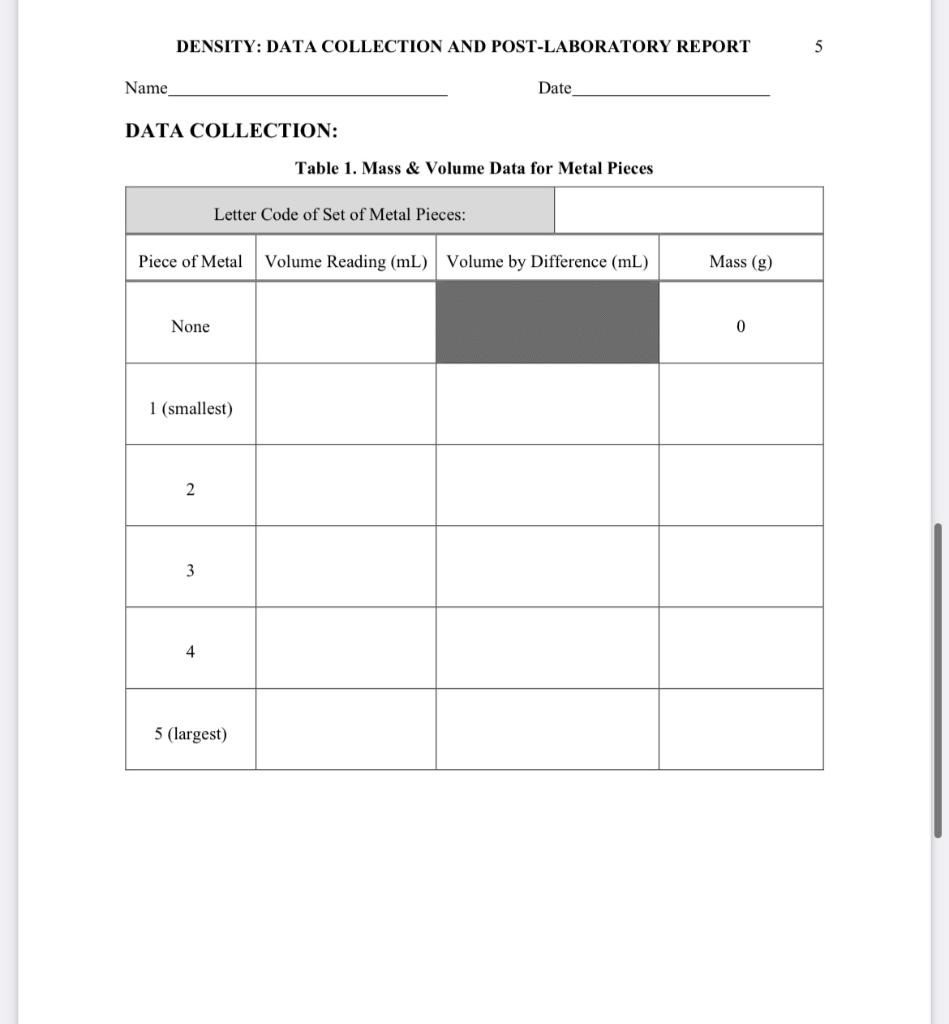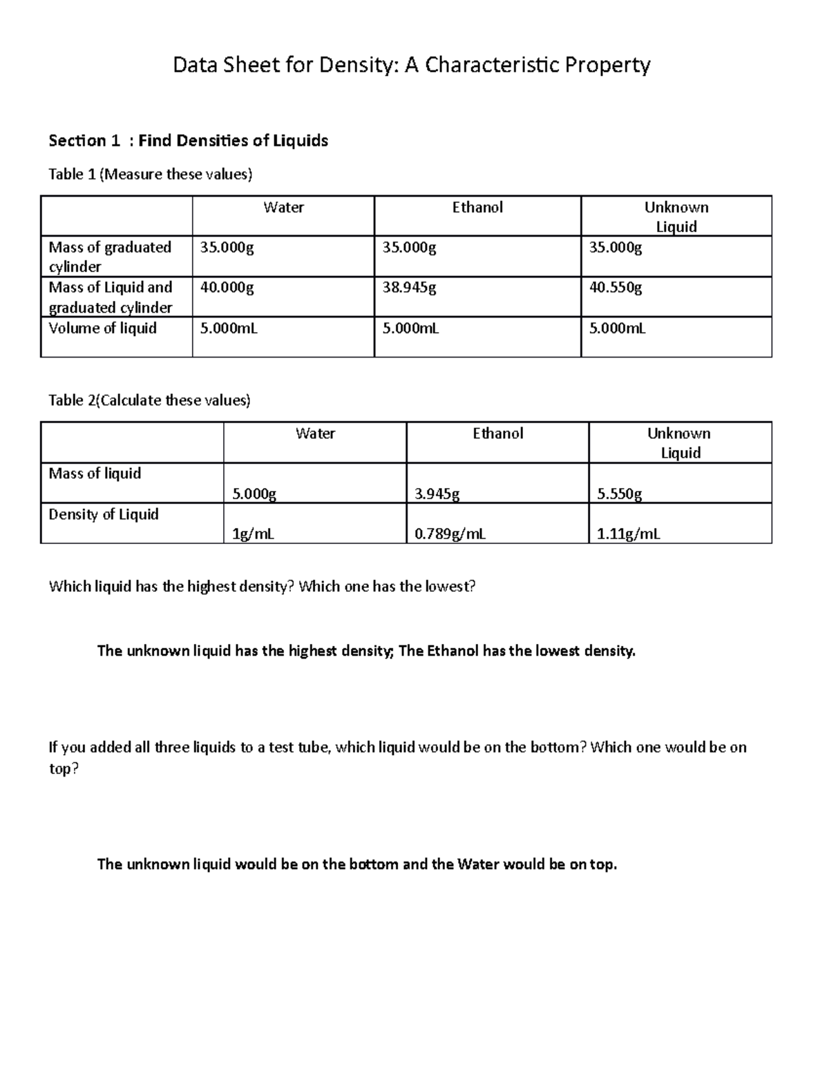 Calculating Density of Solids and Liquids: Lab Data Sheet and | Course Hero