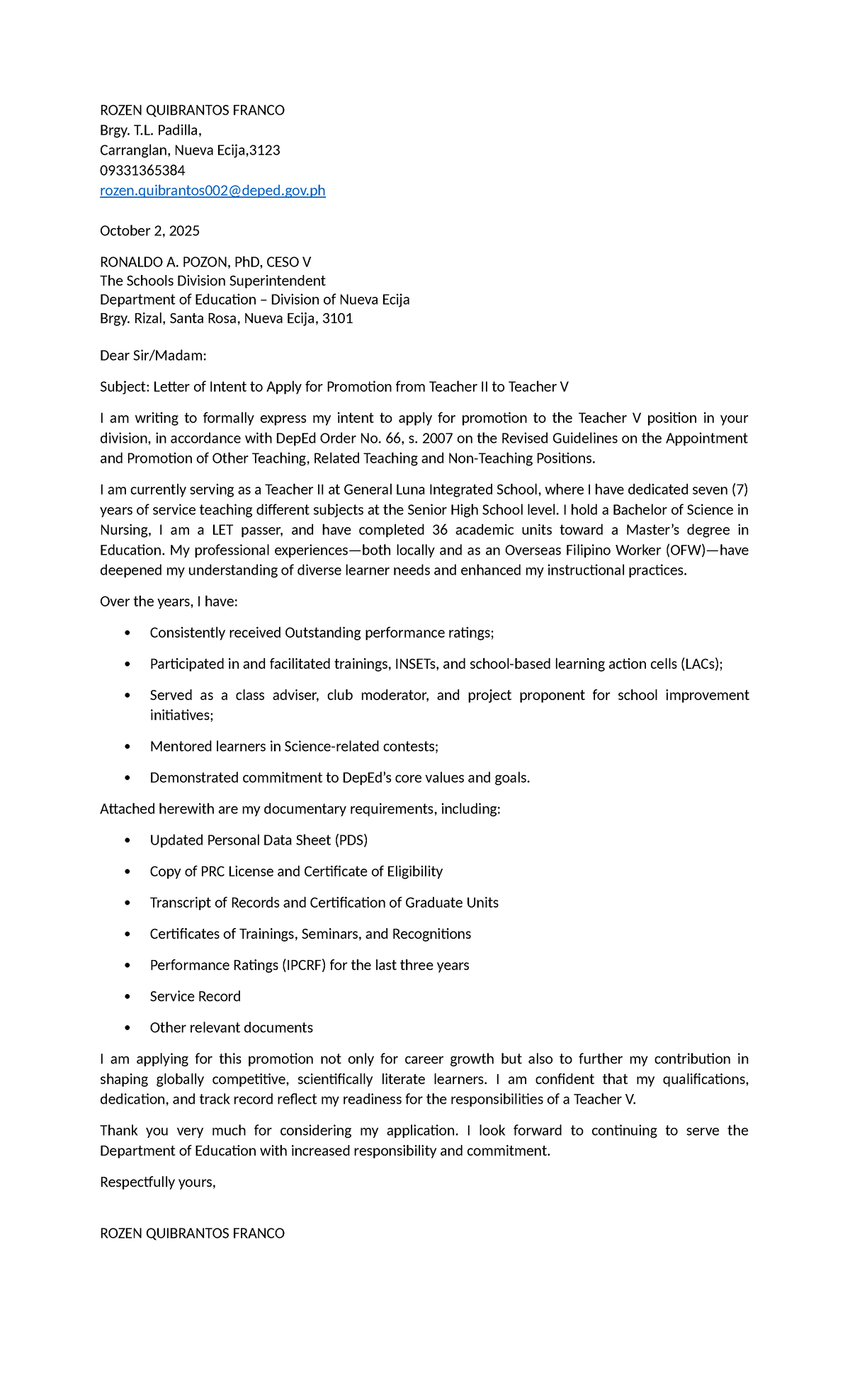 Letter of Intent for Promotion to Teacher V - DepEd Application - Studocu