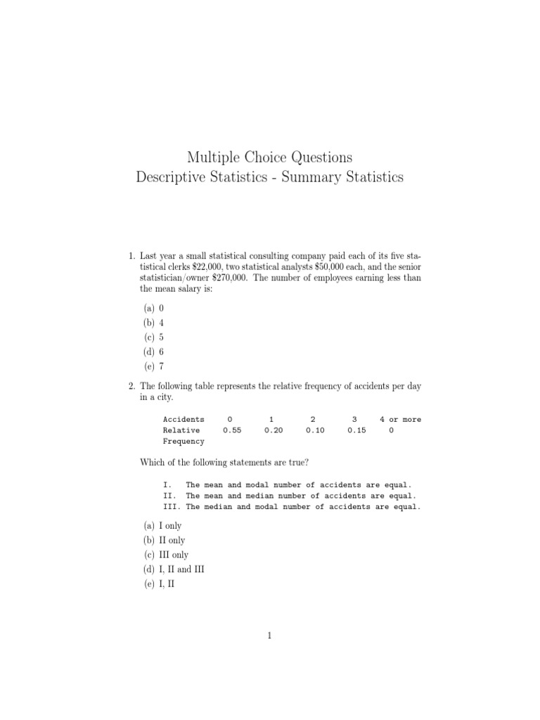 Multiple Choice Questions Descriptive Statistics Summary Statistics ...