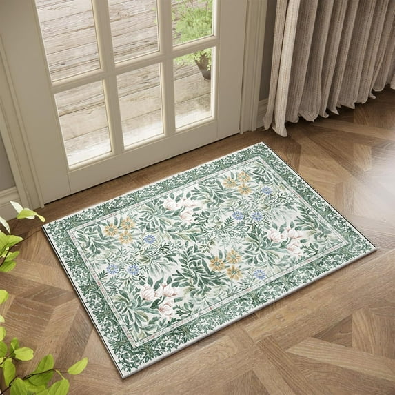 Botanical Floral Washable Entryway Area Rug 2x3 Light Green Cream ...