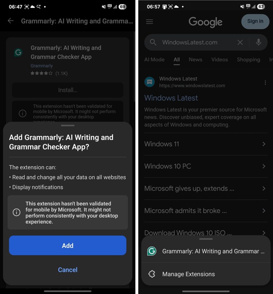 Microsoft Edge on Android tests "Extension v2" with more desktop extensions