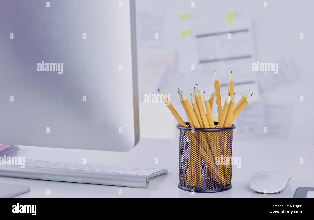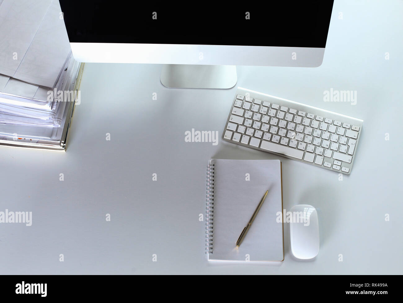 Workspace desktop, documents on the office table Stock Photo - Alamy