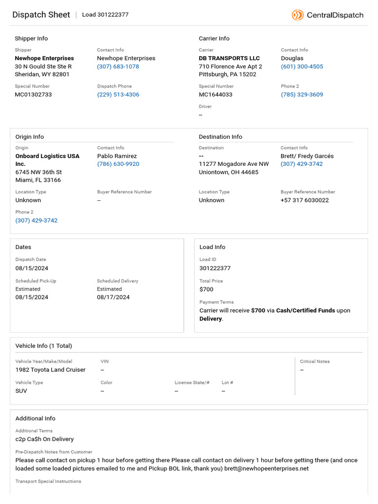 Essential Dispatch Sheet: Order Details and Carrier Agreement | Course Hero