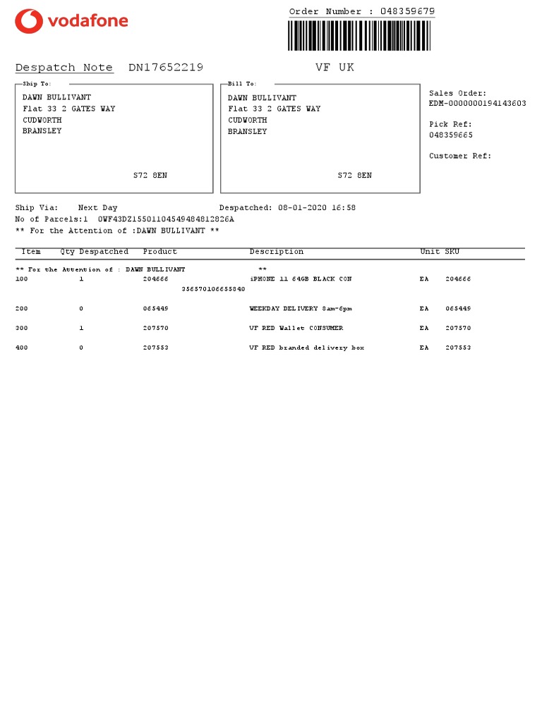 Despatch Note for Dawn Bullivant | PDF