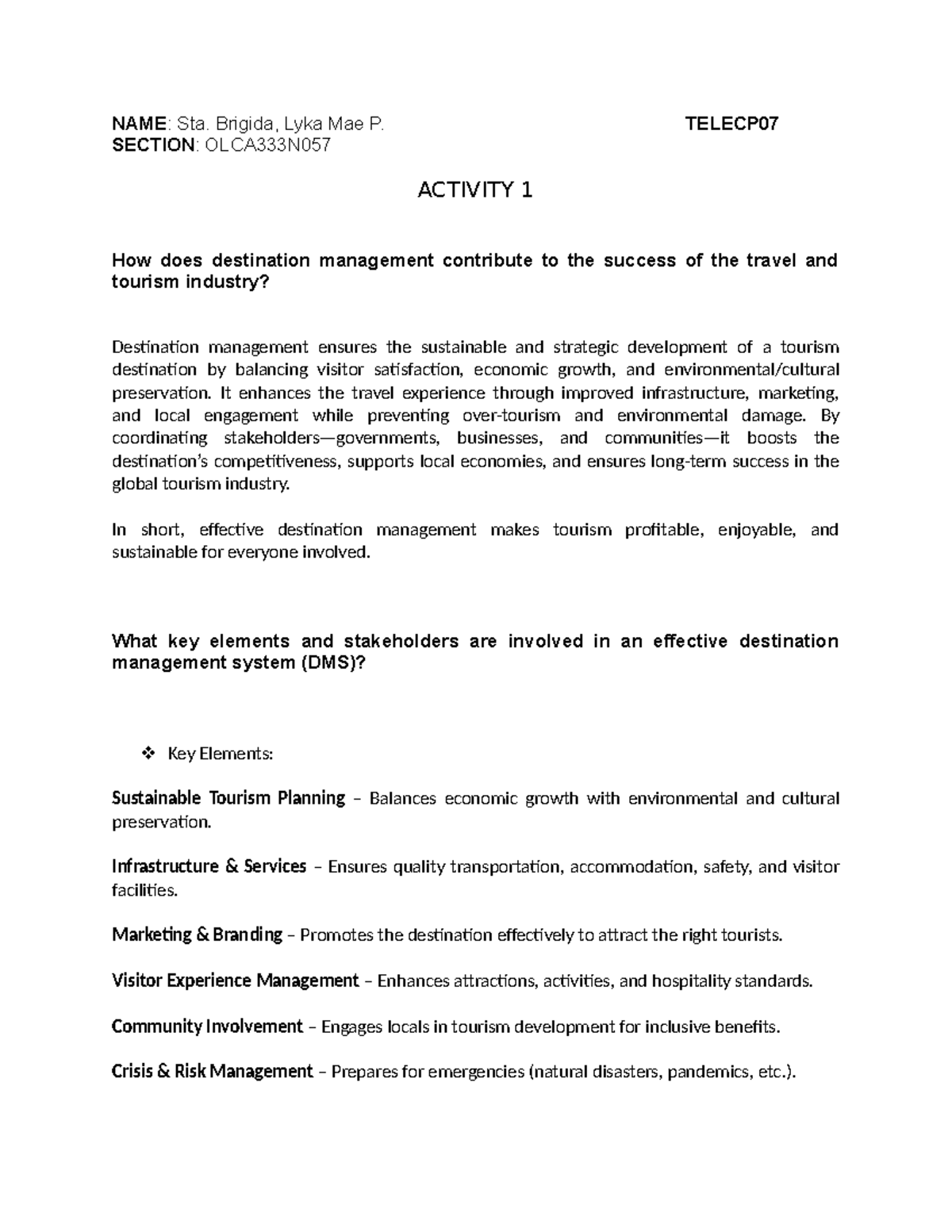 TELECP07 Activity 1: The Role of Destination Management in Tourism ...