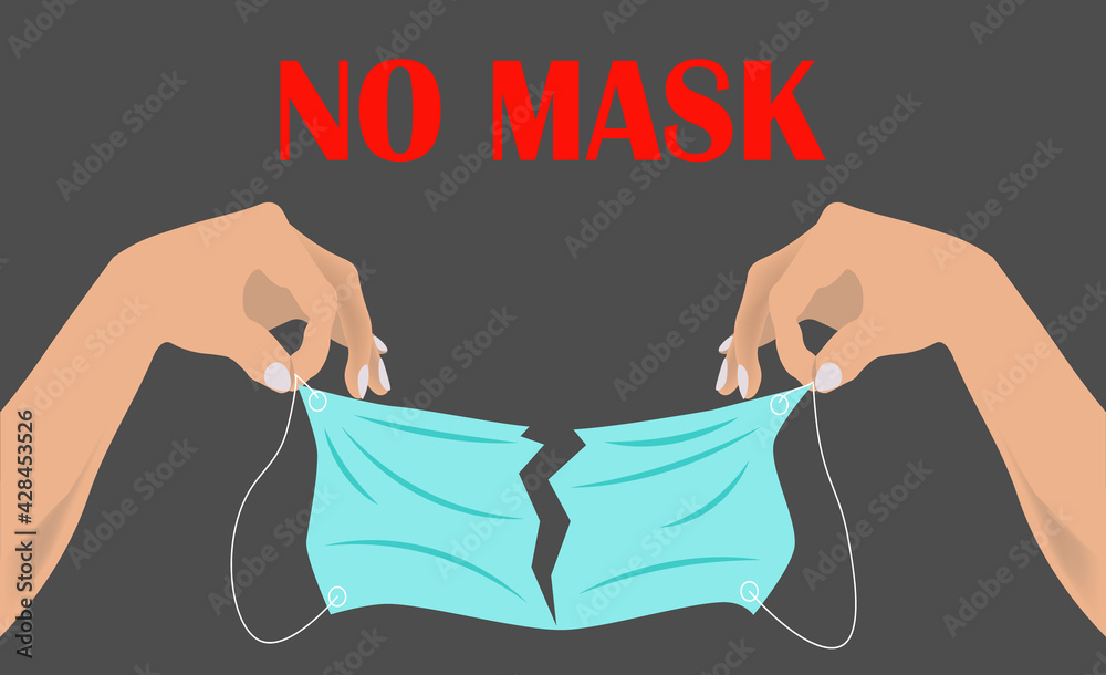 Red lettering No mask. Hands tearing through protective medical ...
