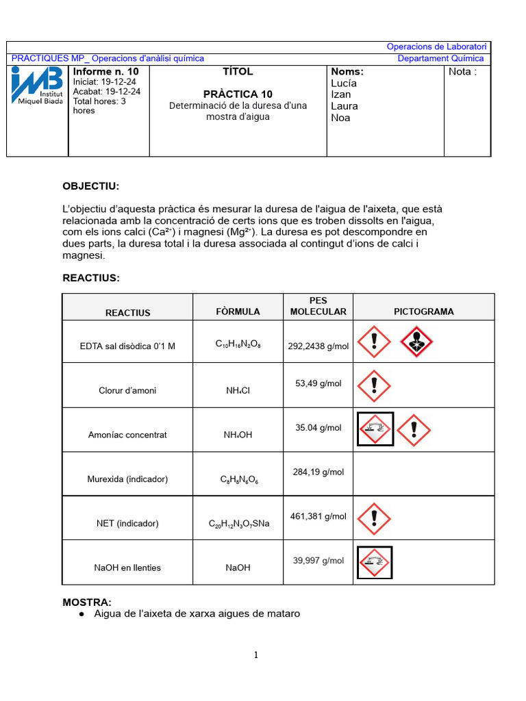 PRÀCTICA 10 - Determinació de La Duresa D'una Mostra D'aigua | PDF