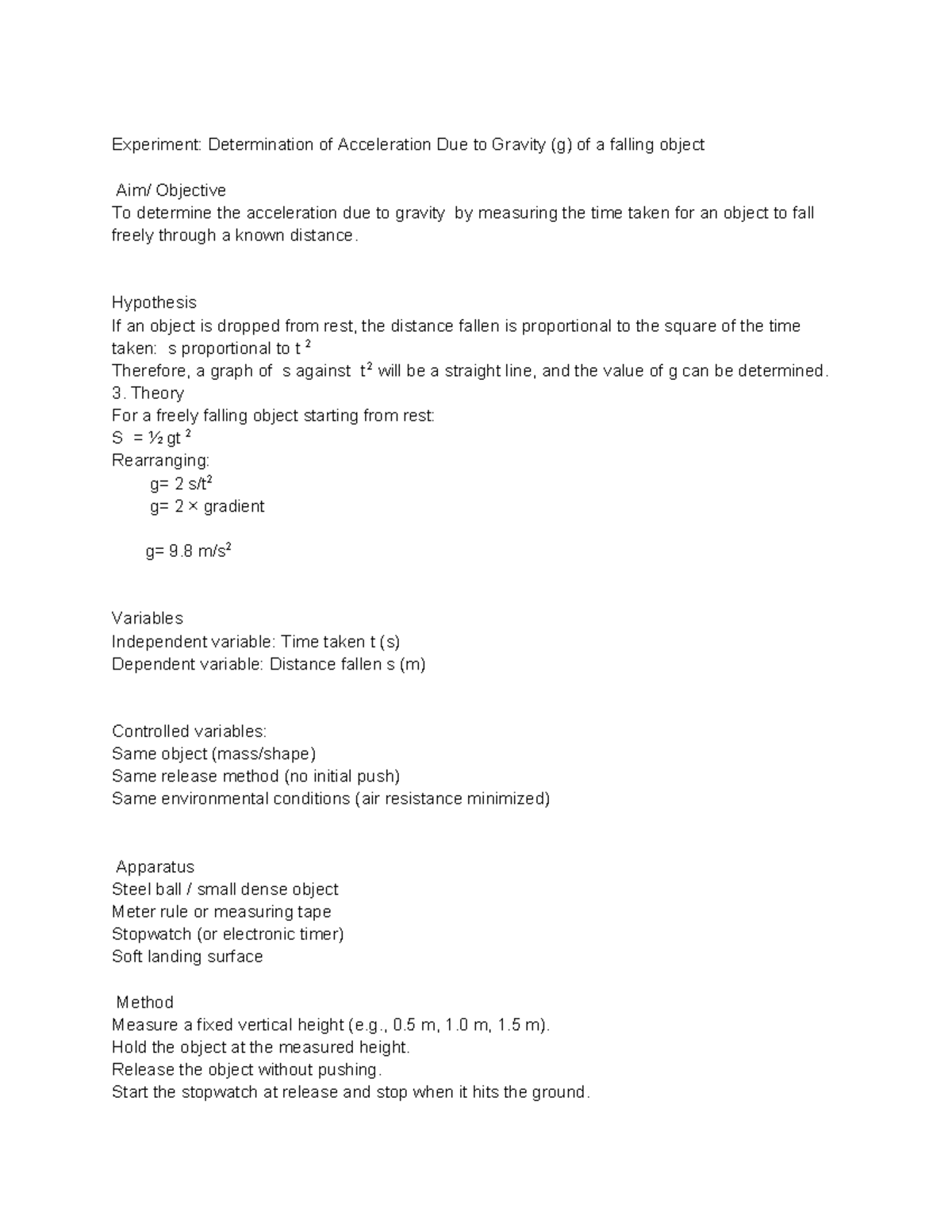 Experiment: Determination of Acceleration Due to Gravity (g) - Studocu