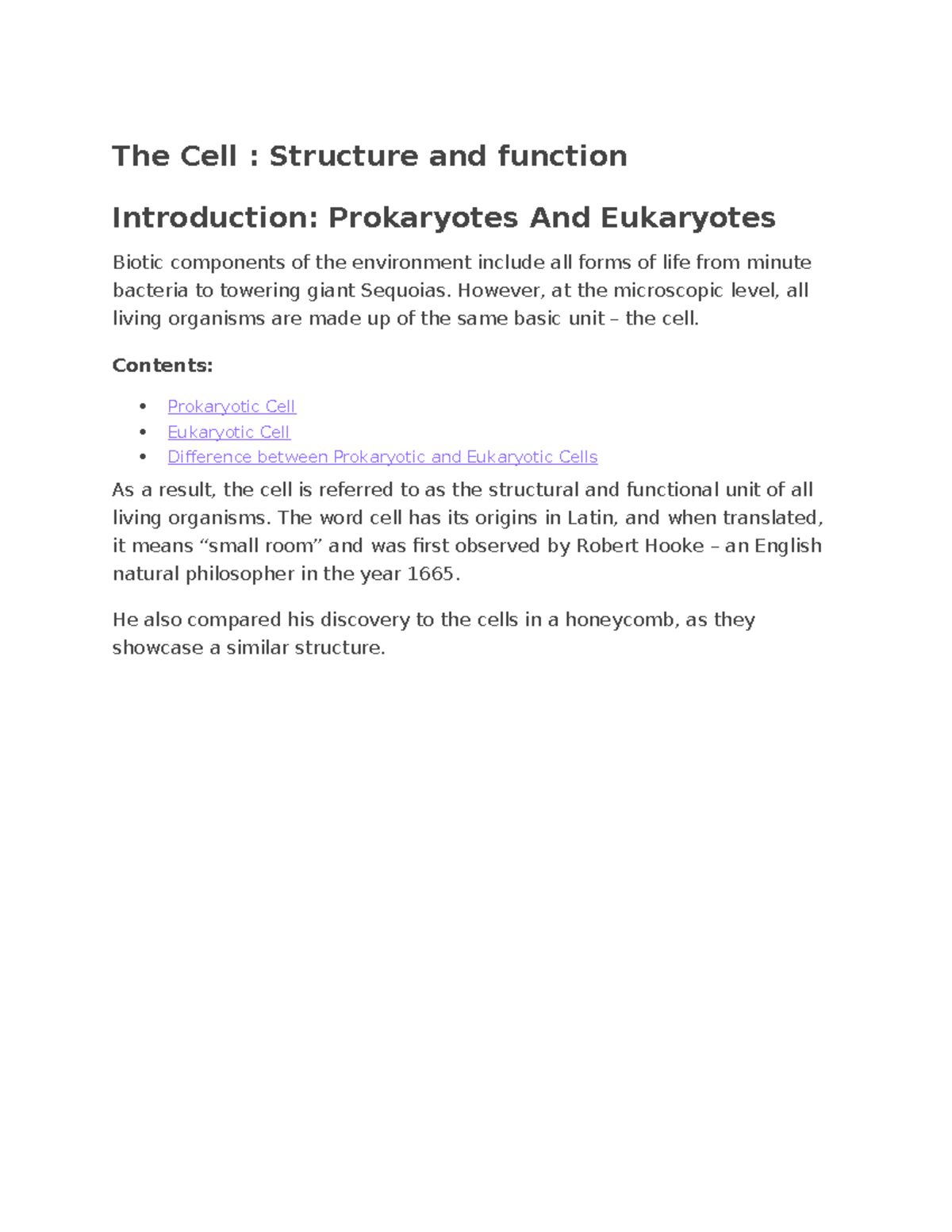 The Cell: Structure & Function - Prokaryotes vs Eukaryotes Notes - Studocu
