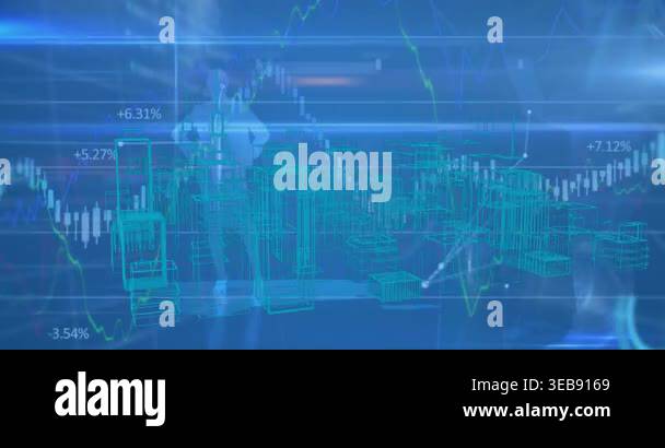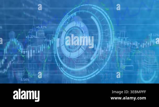 Animation of financial data processing over 3d cityscape drawing ...