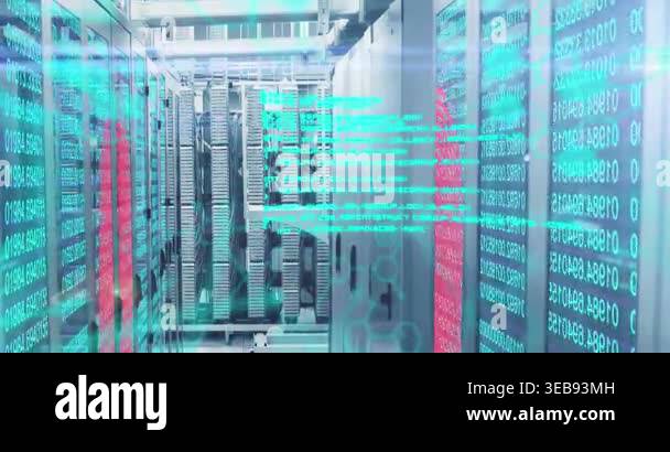 Animation of data processing on digital screen over servers. Computers ...
