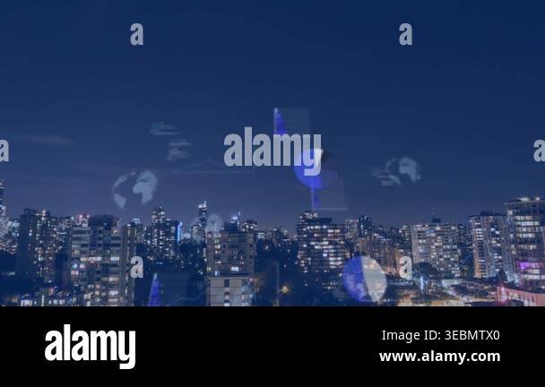 Animation of financial data processing over cityscape. Global ...
