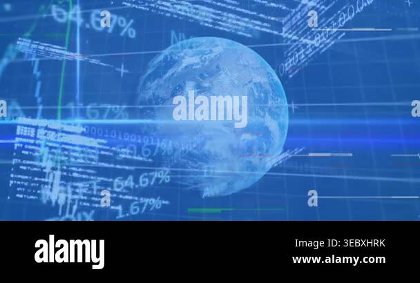Animation of financial data processing with binary coding over globe ...