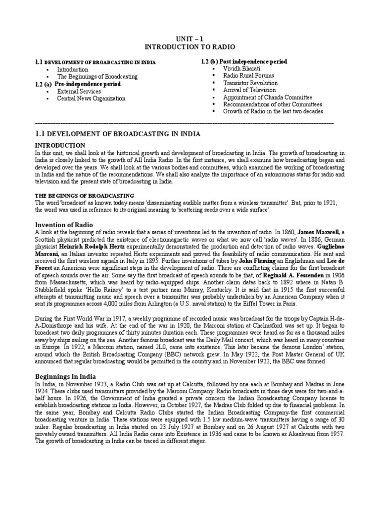 Unit - 1 Introduction To Radio: Development of Broadcasting in India ...