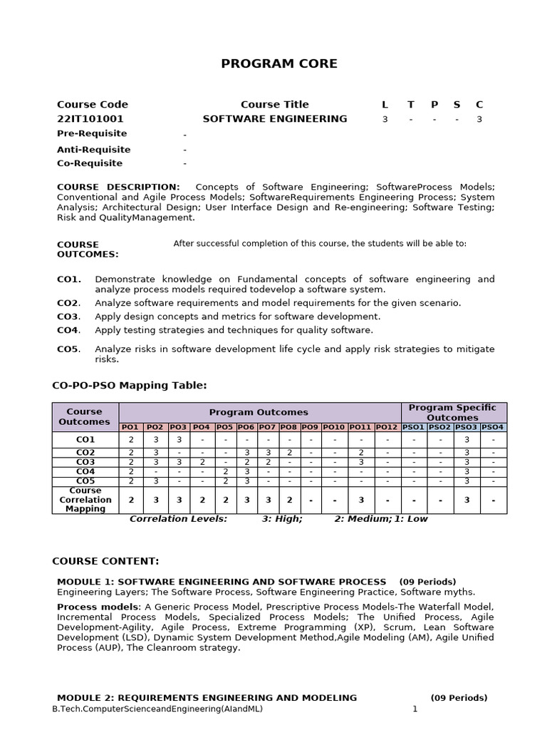 Program Core: Course Code Course Title L T P S C 22IT101001 Software ...
