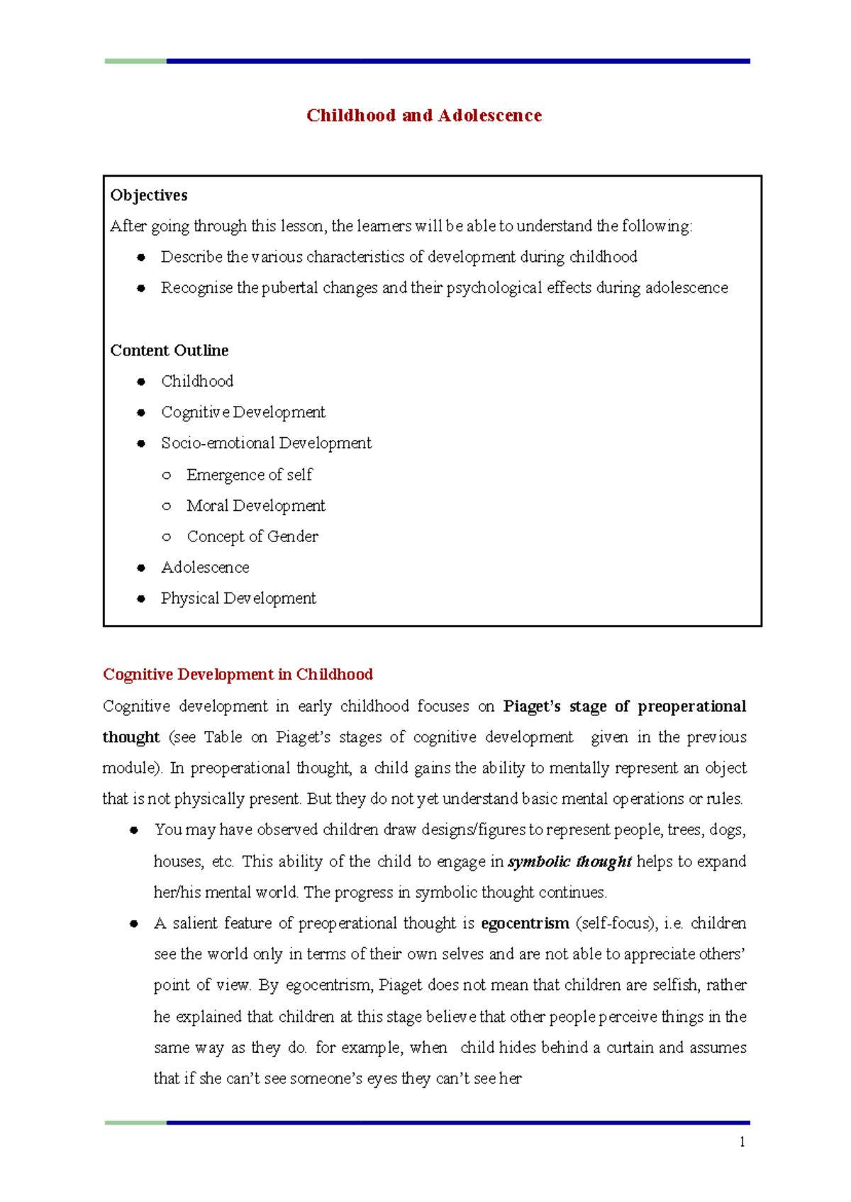 PSY 101: Childhood and Adolescence Developmental Objectives and ...