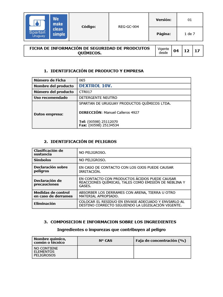 Ficha de Seguridad DEXTROL 10V - Detergente | PDF | Agua | Combustión