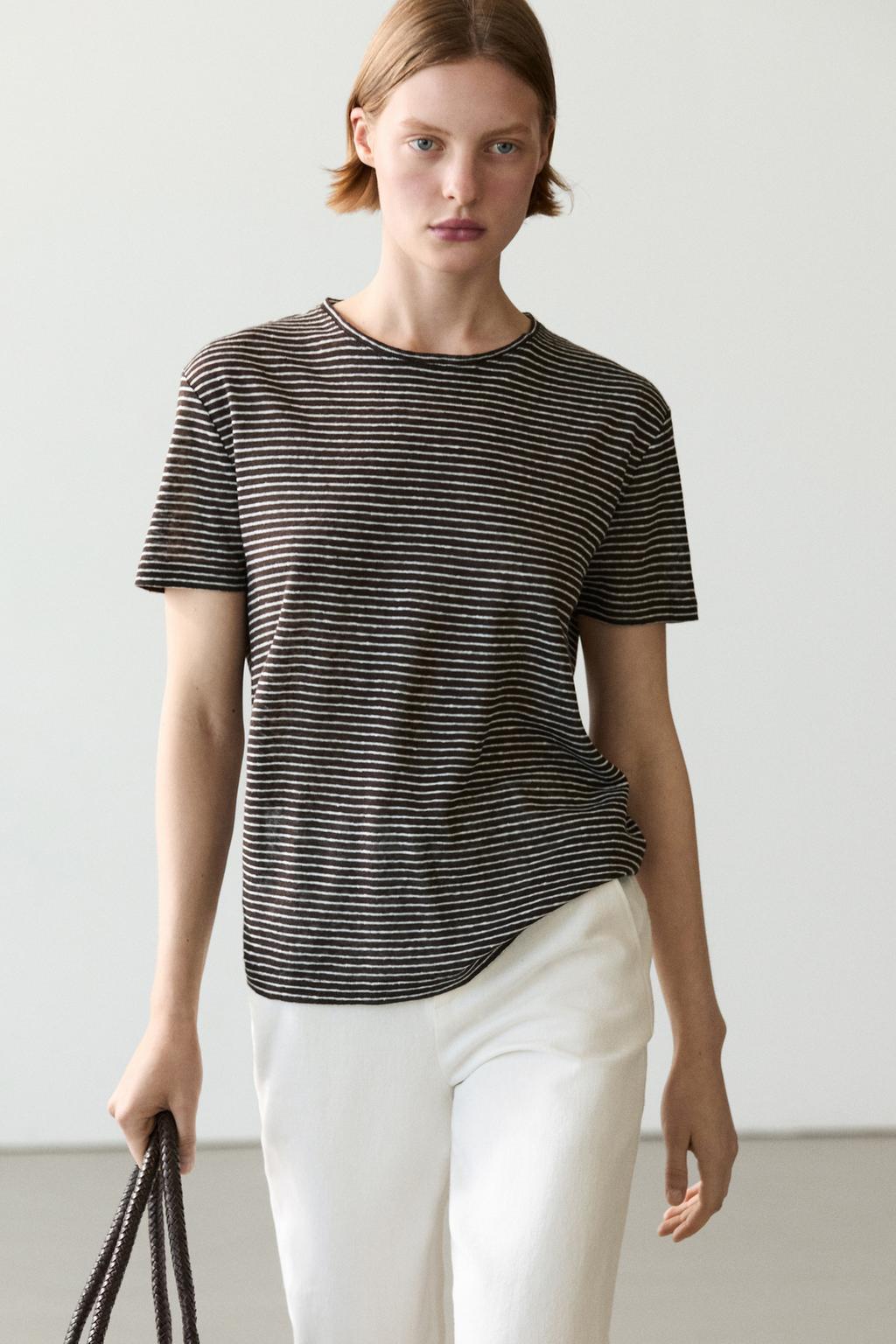 Áo thun sọc regular fit 100% vải lanh · Màu Nâu · T-shirt | Massimo Dutti