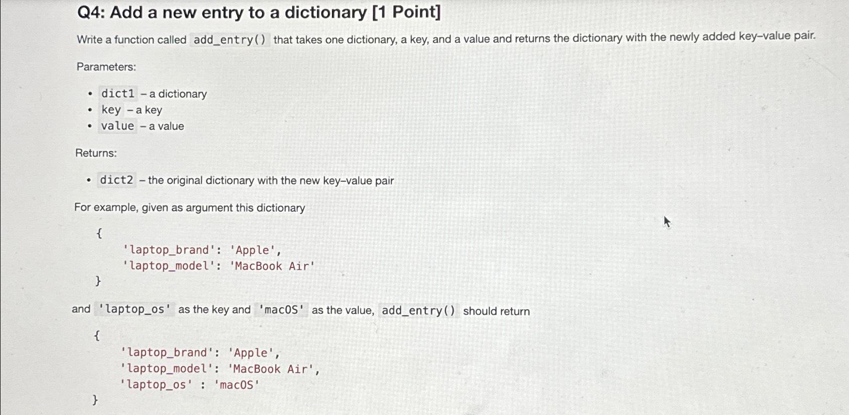 Solved Q4: Add a new entry to a dictionary [1 Point]Write a | Chegg.com