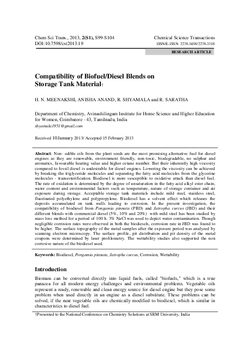 (PDF) Compatibility of Biofuel/Diesel Blends on Storage Tank Material