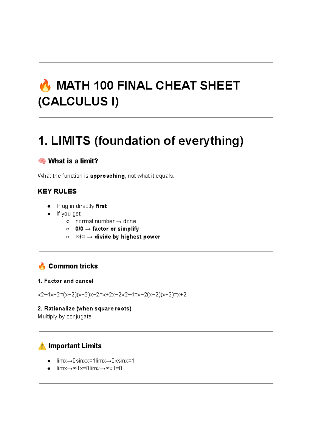 MATH 100 FINAL EXAM CHEAT SHEET (CALCULUS I) - Studocu