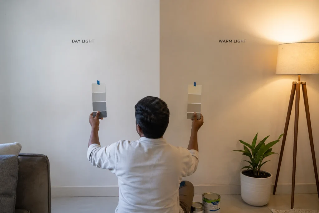 Comparing color samples to wallpaper Stock Photo - Alamy