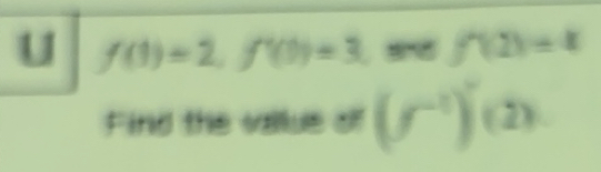 Solved: f(1)=2, f'(1)=3 f'(2)=4 Find the vallue of (f^(-1))(2) [Calculus]