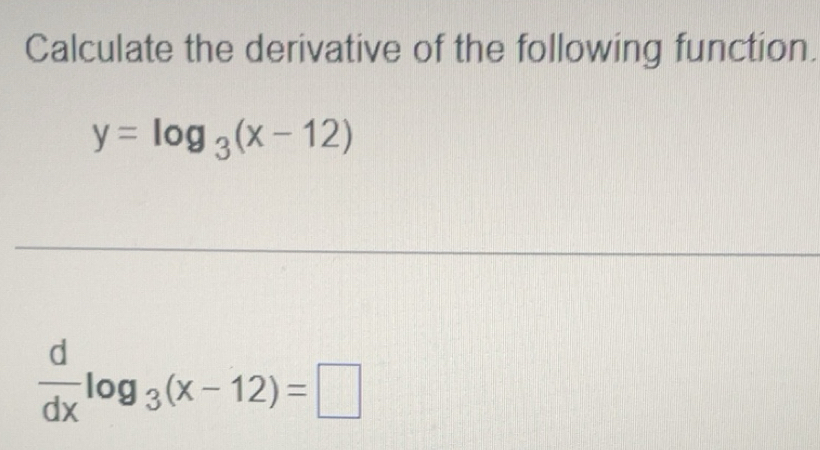 Solved: Calculate the derivative of the following function. y=log _3(x ...