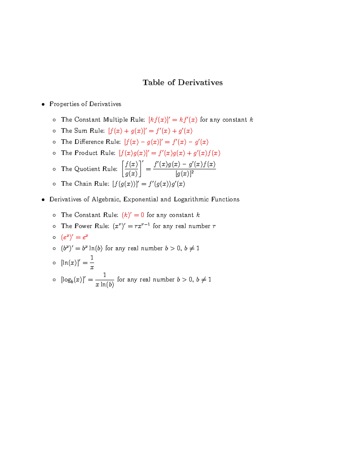 Derivative Formula Sheet