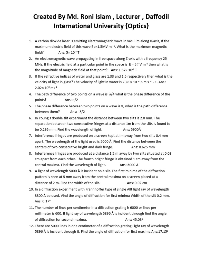 Optics Mathematical Problem With Answer Update | PDF | Diffraction ...