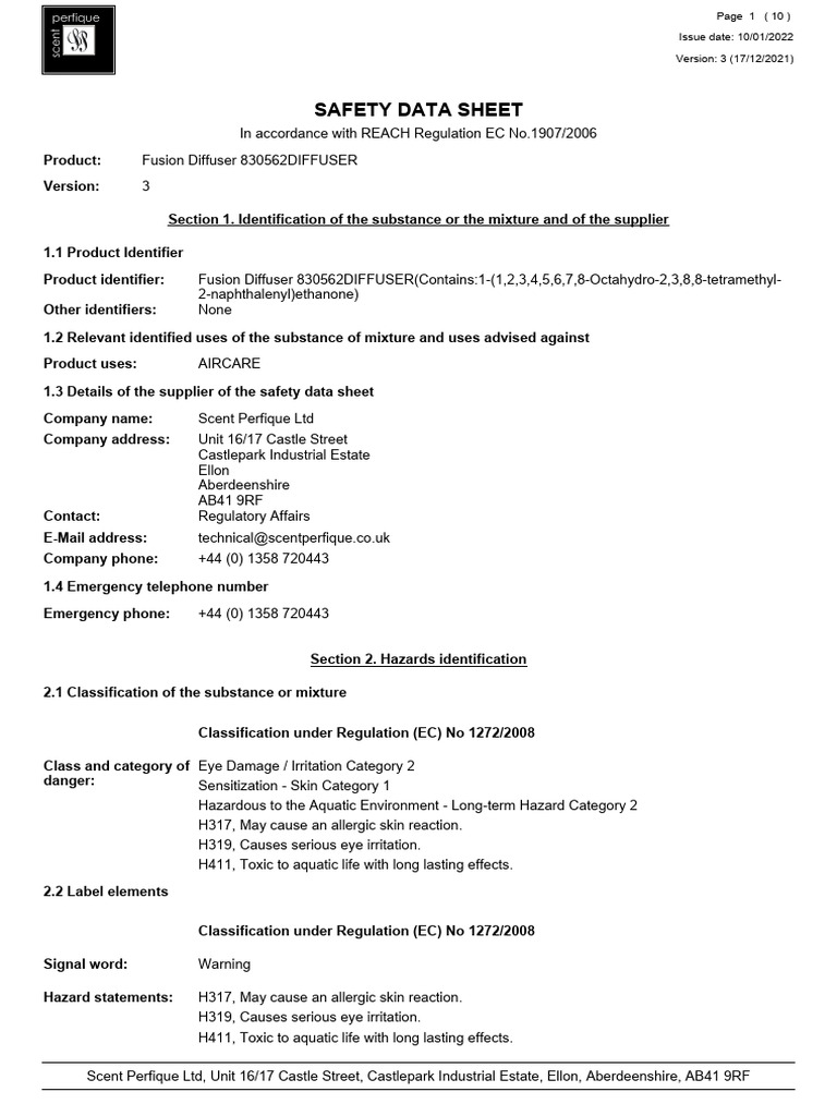Fusion Diffuser CLP Safety Data Sheet (Banded) - 830562DIFFUSER ...