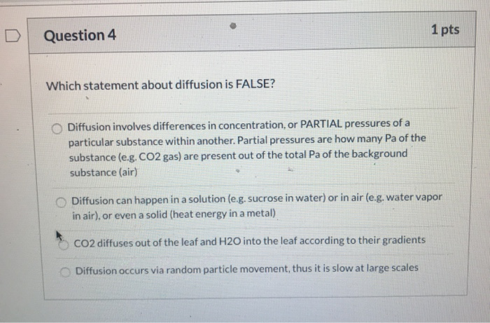 Solved Question 4 1 pts Which statement about diffusion is | Chegg.com